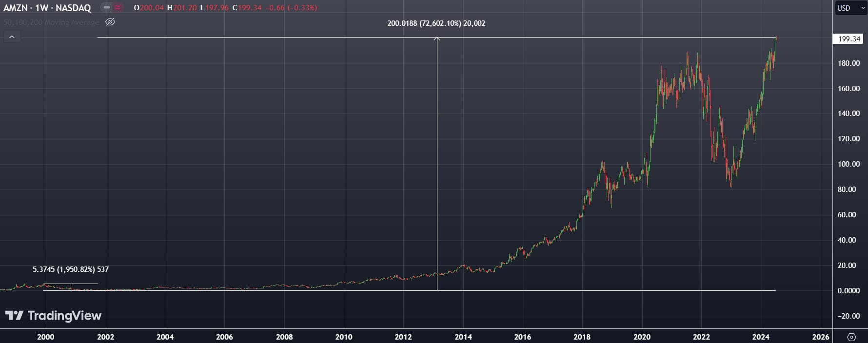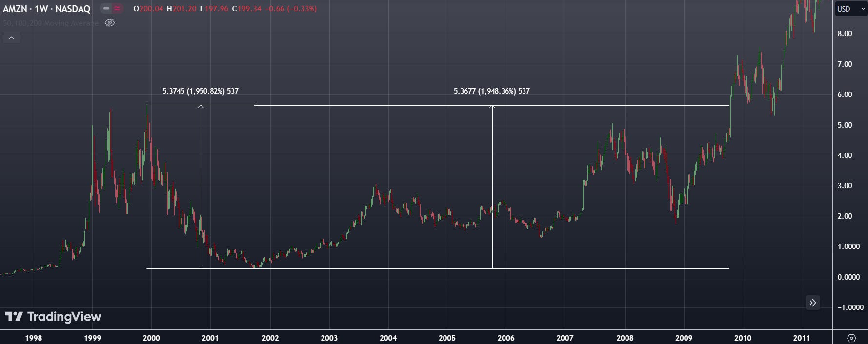 Let’s say you bought Amazon stock at the peak of the dot-com bubble, it would have taken 9 years to break even — That’s without considering inflation, interest rates and opportunity cost. If you bought it just 10 months later, your investment would have shown a 2,000% return over the same period.