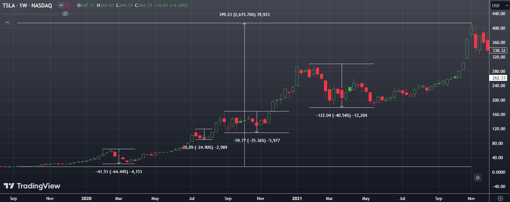 The second rule is don’t invest more than you can afford to lose and never use leverage. Even during Tesla’s epic bull run from 2019-2021, there were four official bear markets (>20% drop).